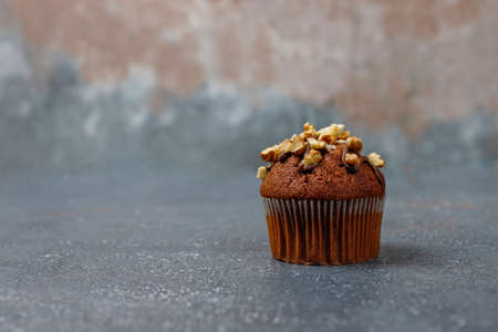 Chocolate-walnut muffins with coffee cup with walnuts on dark background ,Selective Focus.