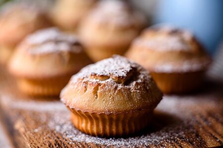 View of fresh muffins cupcake in powdered sugar on cafe counter