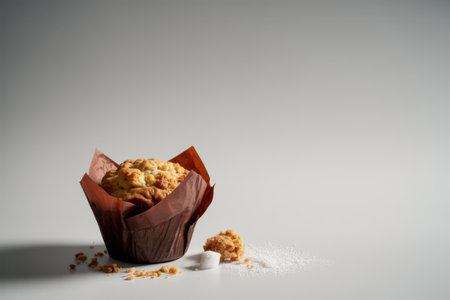 A delicious freshly baked muffin sits nestled in a brown paper cup on a clean white surface Crumbs and a sugar cube add to the scene suggesting a recent indulgence The lighting is soft and diffused creating a pleasing minimalist aesthetic The composition allows ample space for text or graphics making it a versatile image for various uses such as food blogs recipe websites or marketing materials for bakeries and cafes This photograph evokes feelings of comfort warmth and satisfaction associated with enjoying a freshly baked treat