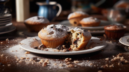 sweet muffins topped with chocolate chips with cinematic light and blurred background