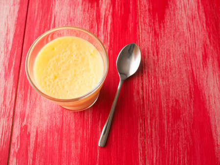 Delicious sweet vanilla pudding on a red wooden table, homemade food concept