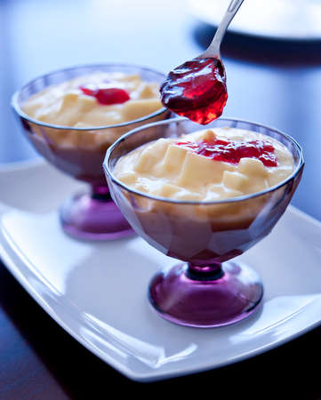 Yellow vanilla pudding with strawberry sauce on rown wooden table