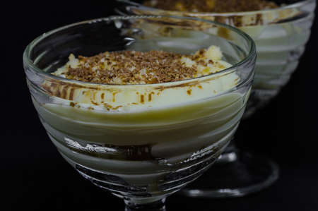 Fresh homemade banana pudding made from scratch for the holidays. Layered with waffers and meringue. Selective focus with blurred foreground and background.