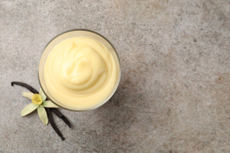 Tasty vanilla pudding, pods and flower on grey table, top view. Space for text