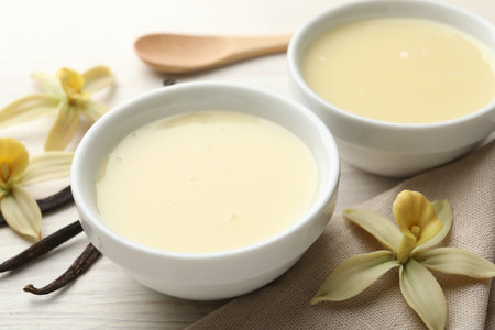 Vanilla pudding in bowl on wooden table, closeup