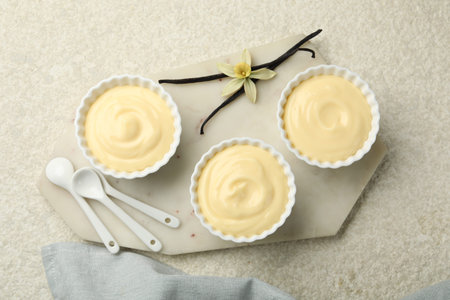 Tasty vanilla pudding with pods and flower on light textured table, closeup