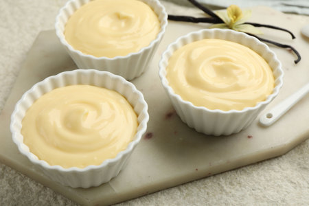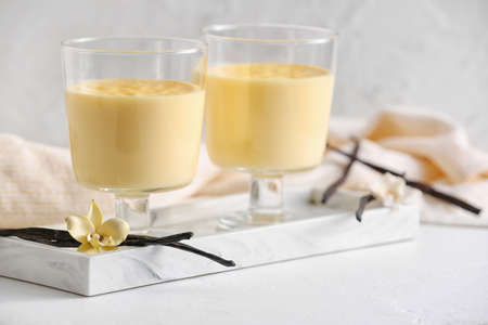 Board with tasty vanilla pudding on light background