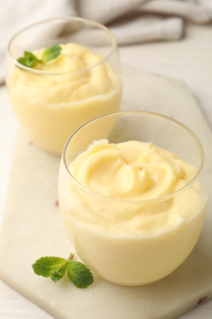 Tasty vanilla pudding with mint on white table, closeup