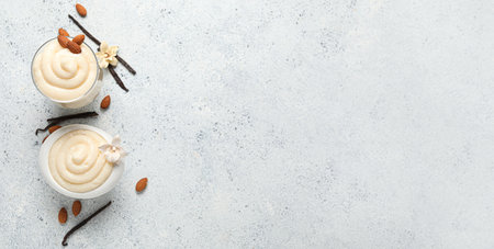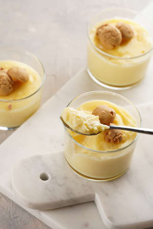 Creamy french vanilla pudding in glass decorated with italian biscuits amaretti on marble board on gray neutral background