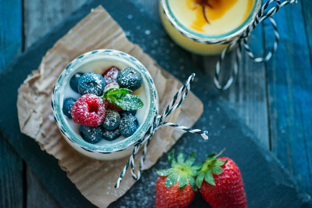 Fresh and healthy natural yogurt with berries on a rustic wooden table