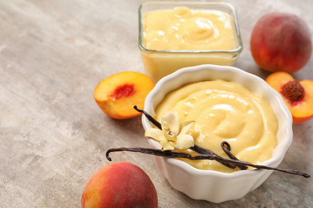 Bowls with delicious vanilla pudding and peaches on grunge background, closeup