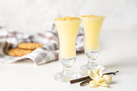 Shots of delicious pudding with cookie crumbs and vanilla sticks on white table