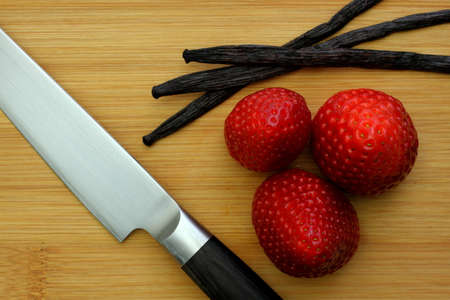 Red ripe strawberries with vanilla and kitchen knife on bamboo background