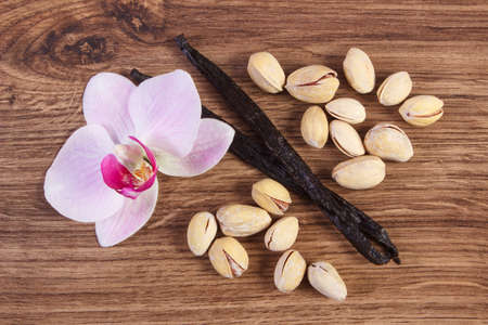 Pistachio nuts, colorful blooming orchid flower and fresh fragrant vanilla sticks pods on wooden background, cosmetics ingredients