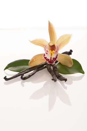 Fresh vanilla blossom with aromatic vanilla sticks arranged neatly on a clean white background
