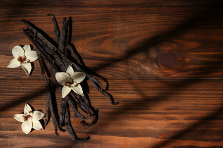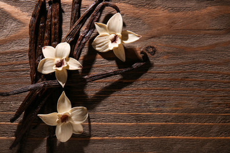 Flat lay composition with vanilla sticks and flower on wooden background. Space for text