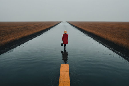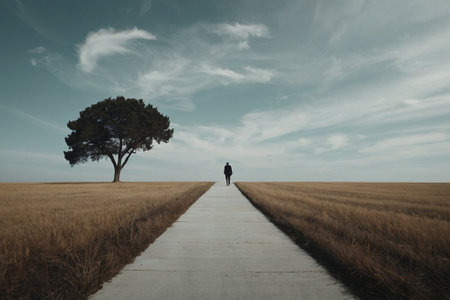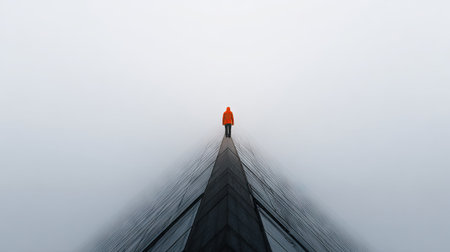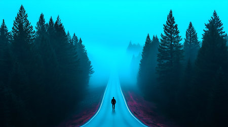A solitary figure walks down an empty road enveloped in thick fog, creating a serene yet mysterious atmosphere that invites personal reflection and contemplation.