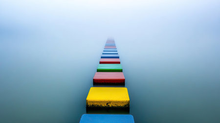 A vibrant and colorful pathway emerges from a thick mist over a still water surface, creating a serene atmosphere perfect for relaxation and contemplation.