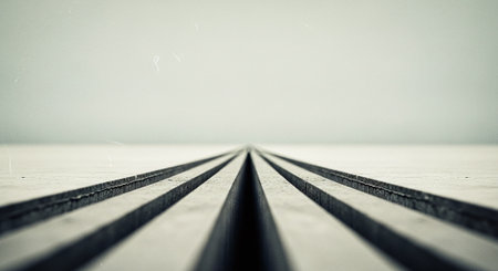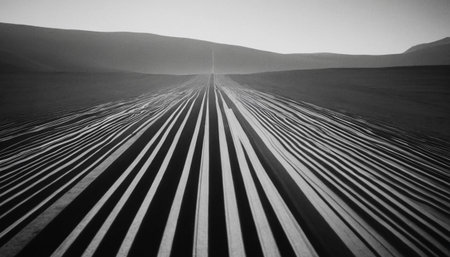 This minimalist photograph captures a serene landscape enveloped in fog, showcasing an infinite horizon and a peaceful water surface in a monochrome theme.
