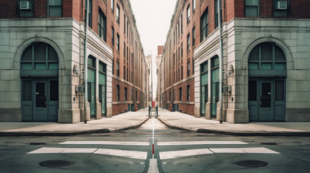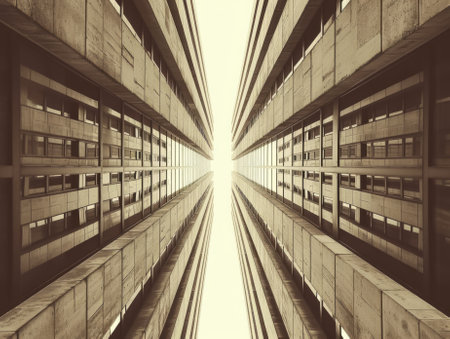 highrise buildings captured in a fish-eye lens style with a minimalist background. the image features clouds and stars, with sunrays shining upon the symmetrical chaos of the dark white and orange buildings. the artwork is by peter gric and creates a passage to a surreal world. ai generated