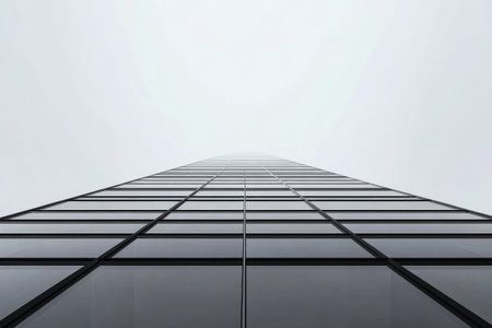 A tall skyscraper with a glass facade stretches upward into a foggy sky. The structure exemplifies modern architecture and creates a striking visual against the overcast backdrop.