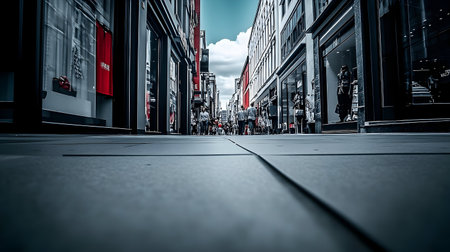 A low angle view of a city street with shops and people, cool toned with dark grey pavement, suitable for various commercial uses.