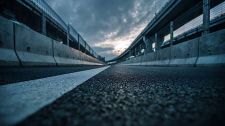 Low angle shot showcasing asphalt highway, divided by a white line, seen beneath two bridges against a clouded, slightly sunlit sky. Concrete barriers line the roadway.
