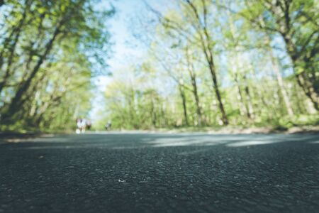 A view of a road stretching into the distance at sunset. The image displays parallel yellow lines with a blurred background. The trees frame the road on both sides. The scene is bathed in warm colors with low lighting. Suitable for editorial and commercial projects.