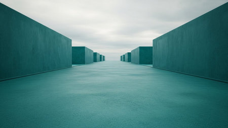 A stark, minimalist hallway stretches into infinity, its repeating geometric structure creating a powerful sense of depth and perspective. The entire scene is bathed in a cool, uniform cyan light, highlighting the smooth, clean surfaces of the walls, floor, and ceiling. The vanishing point draws the eye into the distance, suggesting an endless, perhaps disorienting, passage.