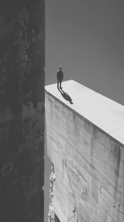 A solitary figure sits quietly at the edge of a misty bridge, enveloped by fog, evoking deep feelings of loneliness and contemplation.