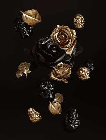 Black and golden roses and human skulls flying in the air on a black background. Creative Halloween or Santa Muerte concept. Luxurious spooky cult concept.