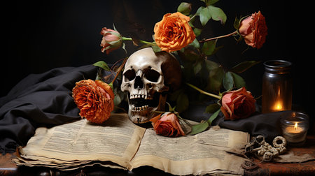Still life with human skull, roses and old book on dark background. AI generative