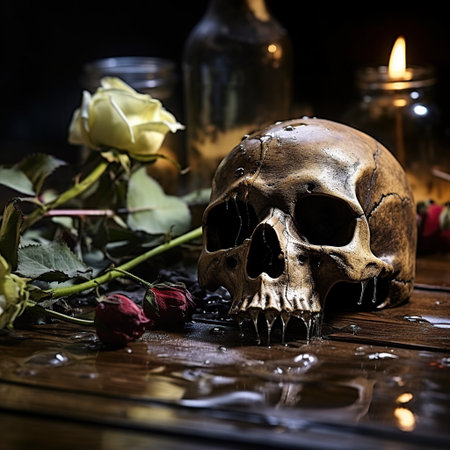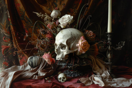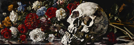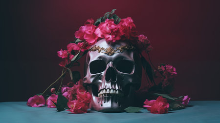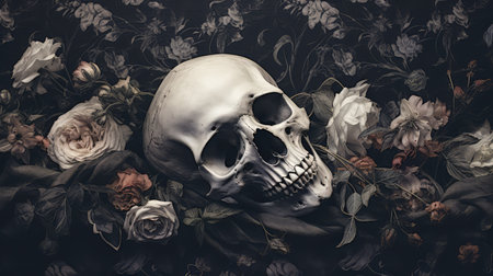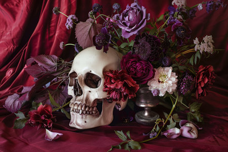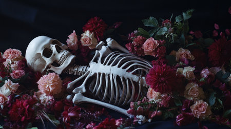 Elegance in the macabre: A skeleton intertwined with flowers, captured in a dark and romantic still life composition