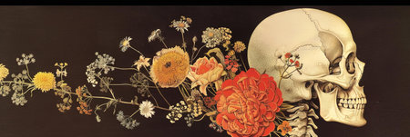 An AI generated illustration of a human skull adorned with a variety of colorful wildflowers