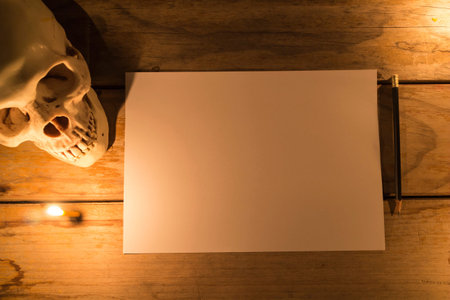 Human skull with candle light and white paper with pencil on wooden table, Decorated for Halloween Theme with copy space.