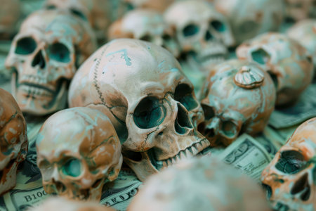 Skulls are carefully placed on scattered dollar bills, creating a striking visual effect against the soft evening light.