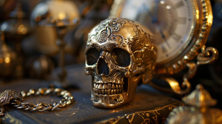 A close-up of a decorative gold skull with intricate designs, placed in an antique setting with vintage items in the background.
