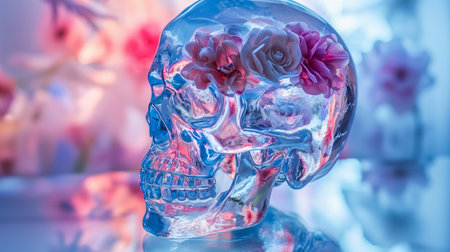 An AI generated illustration of a human skull adorned with a bouquet of red roses