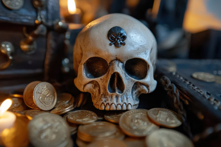The focal point features a skull adorned with a black symbol, resting among scattered coins and treasure chests, creating a mysterious and adventurous ambiance.