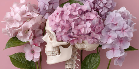 A striking composition featuring a human skull adorned with delicate pink hydrangea flowers against a soft pink background, merging notions of beauty and mortality in a captivating visual.