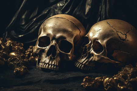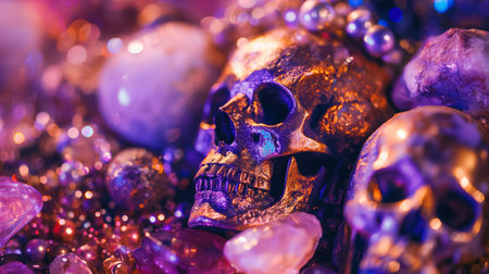 Golden-hued skulls lie entangled among an assortment of sparkling jewels and stones, creating a mysteriously luxurious and macabre scene.