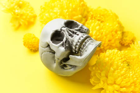 Human skull with flowers on yellow background, closeup