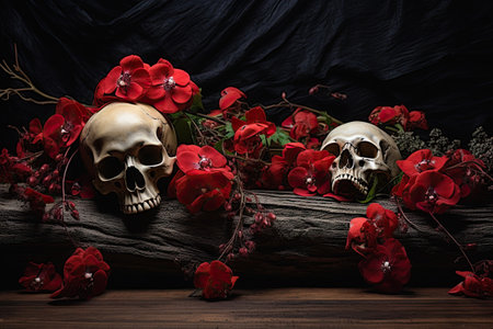 Depiction of skulls on dry wood with red flowers on black background