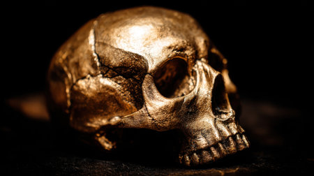 A stunning golden human skull resting on a black backdrop, showcasing intricate details and a reflective surface, ideal for artistic, educational, or thematic projects.