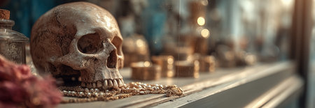 A decorative skull surrounded by jewelry and vintage items on a dimly lit surface