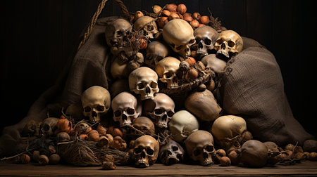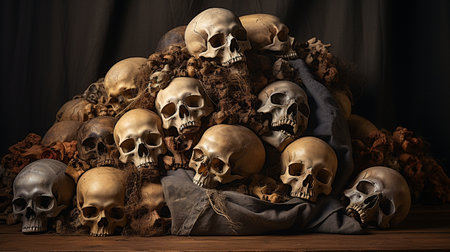 Dark and eerie skulls are piled together, creating a captivating and chilling scene.