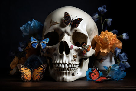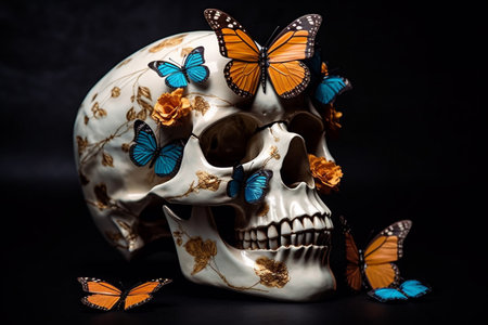 flower butterfly art halloween skull skeleton death design bone illustration. Generative AI.