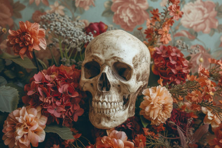 Skull surrounded by flowers in front of floral patterned wall and wallpaper, concept of beauty and mortality