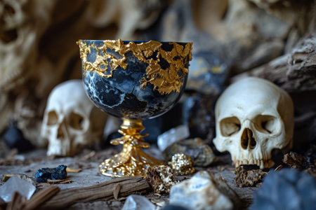 Mystical golden chalice with skulls and crystals