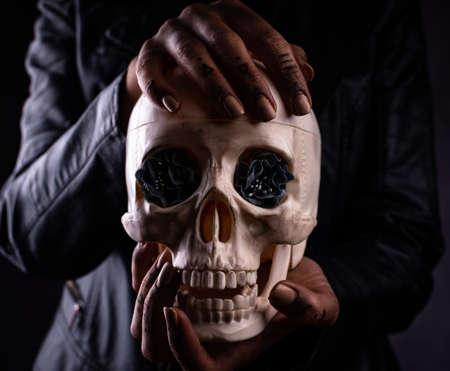 Human skull head in a dark background. Scary skull Halloween concept